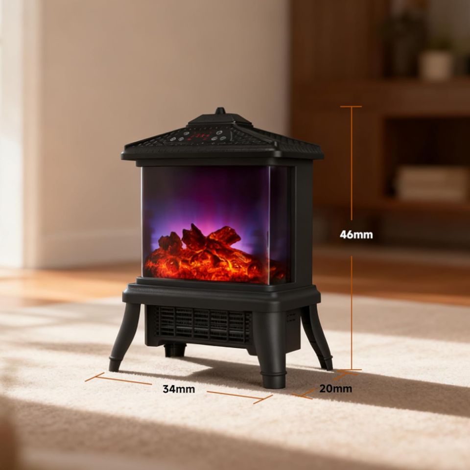 - The 3S heated fireplace features three-level wind speed adjustment, presents a full-curved 3D flame effect, and simulates the sound of real burning wood. The flame can show a colorful combination of orange, blue, and purple, and the warm air coverage reaches up to 300 square feet, easily warming the entire space.